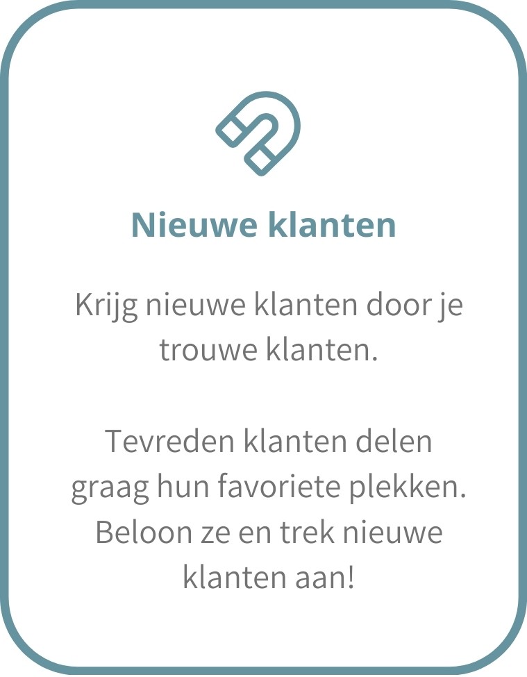 Voor elke nieuwe klant die wordt aangedragen wordt de bestaande klant beloond met een Tell a friend reward. Wat de rewards zijn bepaal jezelf.